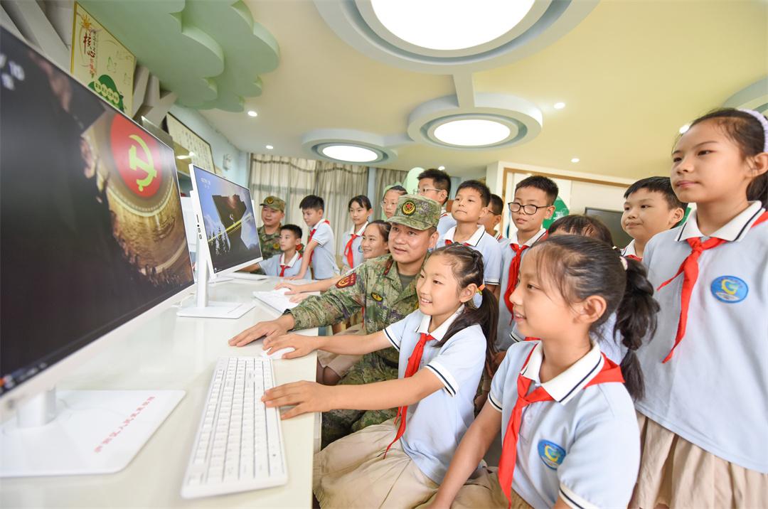 圖為合肥市廬陽(yáng)區(qū)民兵與學(xué)生一起觀看紅色紀(jì)錄片《薪火傳承》。