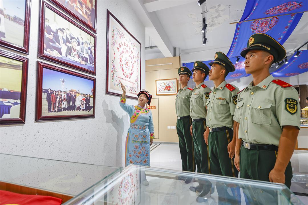 圖為繡娘為武警官兵講述羌繡知識(shí)。