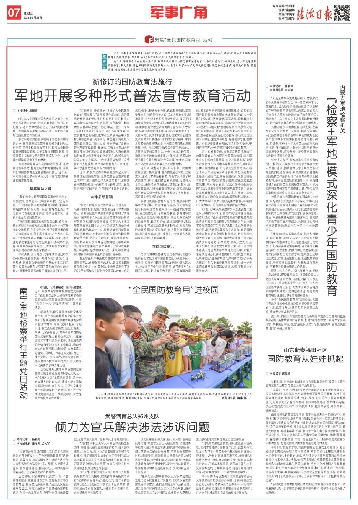 連日來,軍地聯(lián)合積極創(chuàng)新方法手段,組織開展新修訂的國防教育法普法宣傳、參觀紅色場館、緬懷先烈、青少年進軍營等內(nèi)容豐富、形式多樣、特色鮮明的國防教育實踐活動,教育引導(dǎo)官兵和廣大群眾強化國防觀念和憂患意識,增強關(guān)心國防、熱愛國防、建設(shè)國防、保衛(wèi)國防的思想自覺和行動自覺。