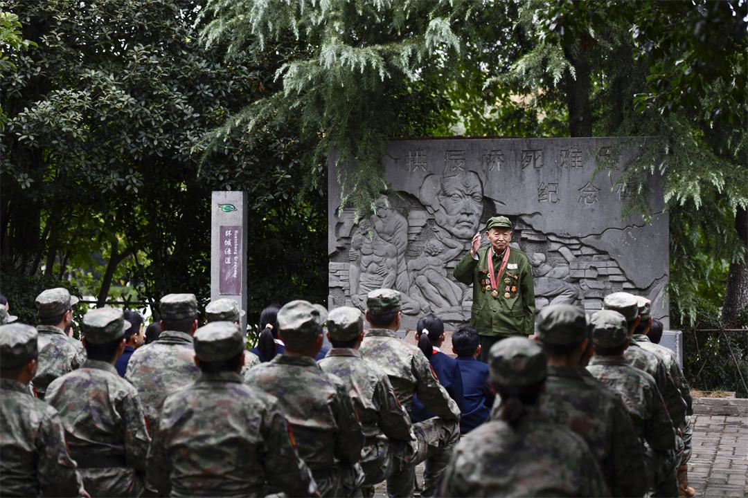 圖為89歲抗美援朝老兵楊克美在烈士紀(jì)念碑前講述戰(zhàn)斗故事。