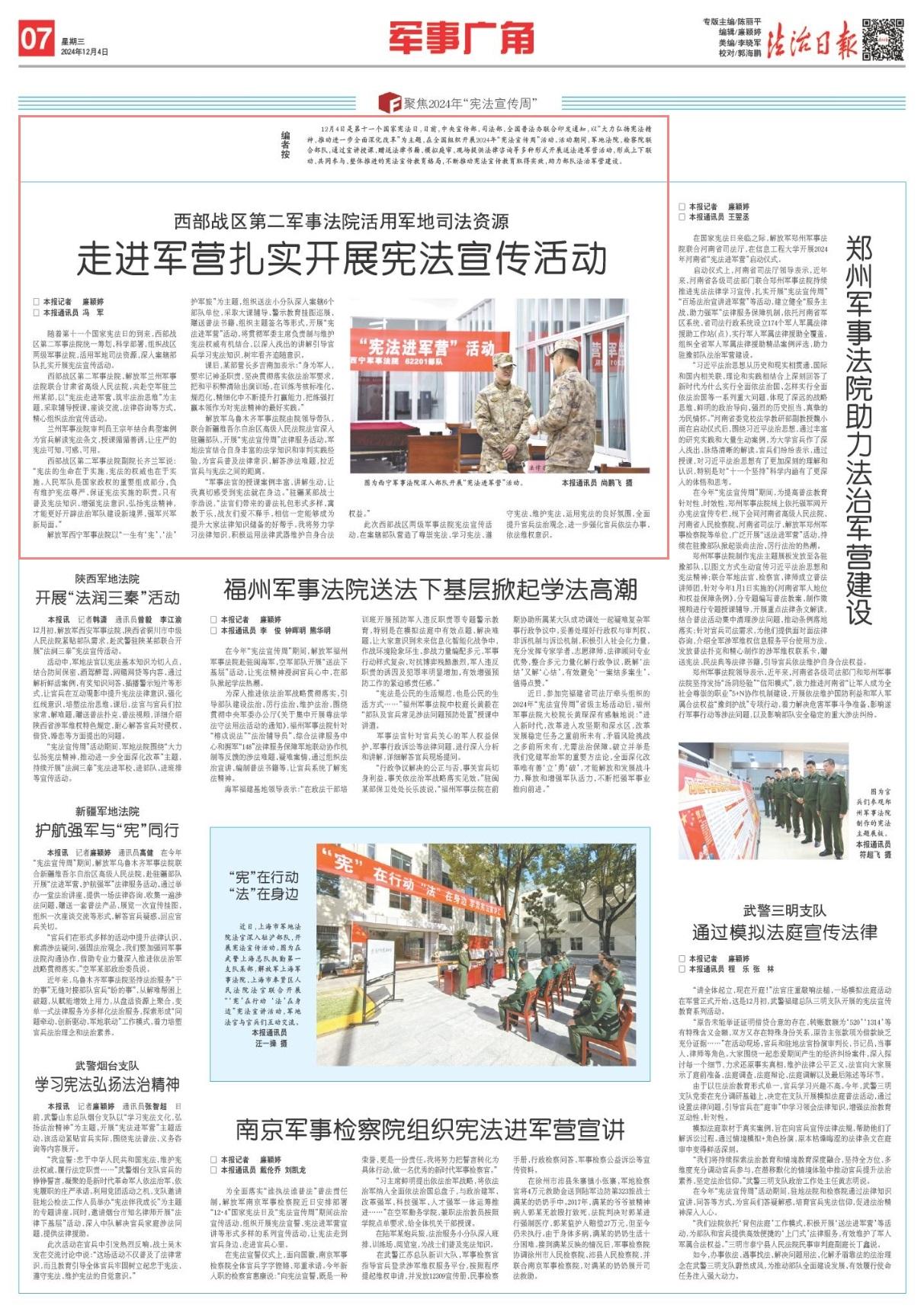 隨著第十一個國家憲法日的到來,西部戰(zhàn)區(qū)第二軍事法院統(tǒng)一籌劃、科學(xué)部署,組織戰(zhàn)區(qū)兩級軍事法院,活用軍地司法資源,深入案轄部隊(duì)扎實(shí)開展憲法宣傳活動。