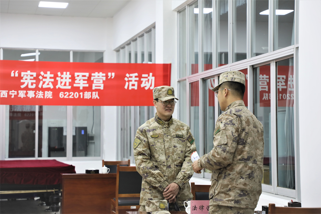 解放軍西寧軍事法院以“一生有‘憲’,‘法’護(hù)軍旅”為主題,組織送法小分隊(duì)深入案轄6個部隊(duì)單位,采取大課輔導(dǎo)、警示教育掛圖巡展、贈送普法書籍、組織主題簽名等形式,開展“憲法進(jìn)軍營”活動,將貫徹軍委主席負(fù)責(zé)制與維護(hù)憲法權(quán)威有機(jī)結(jié)合,以深入淺出的講解引導(dǎo)官兵學(xué)習(xí)憲法知識,樹牢看齊追隨意識。