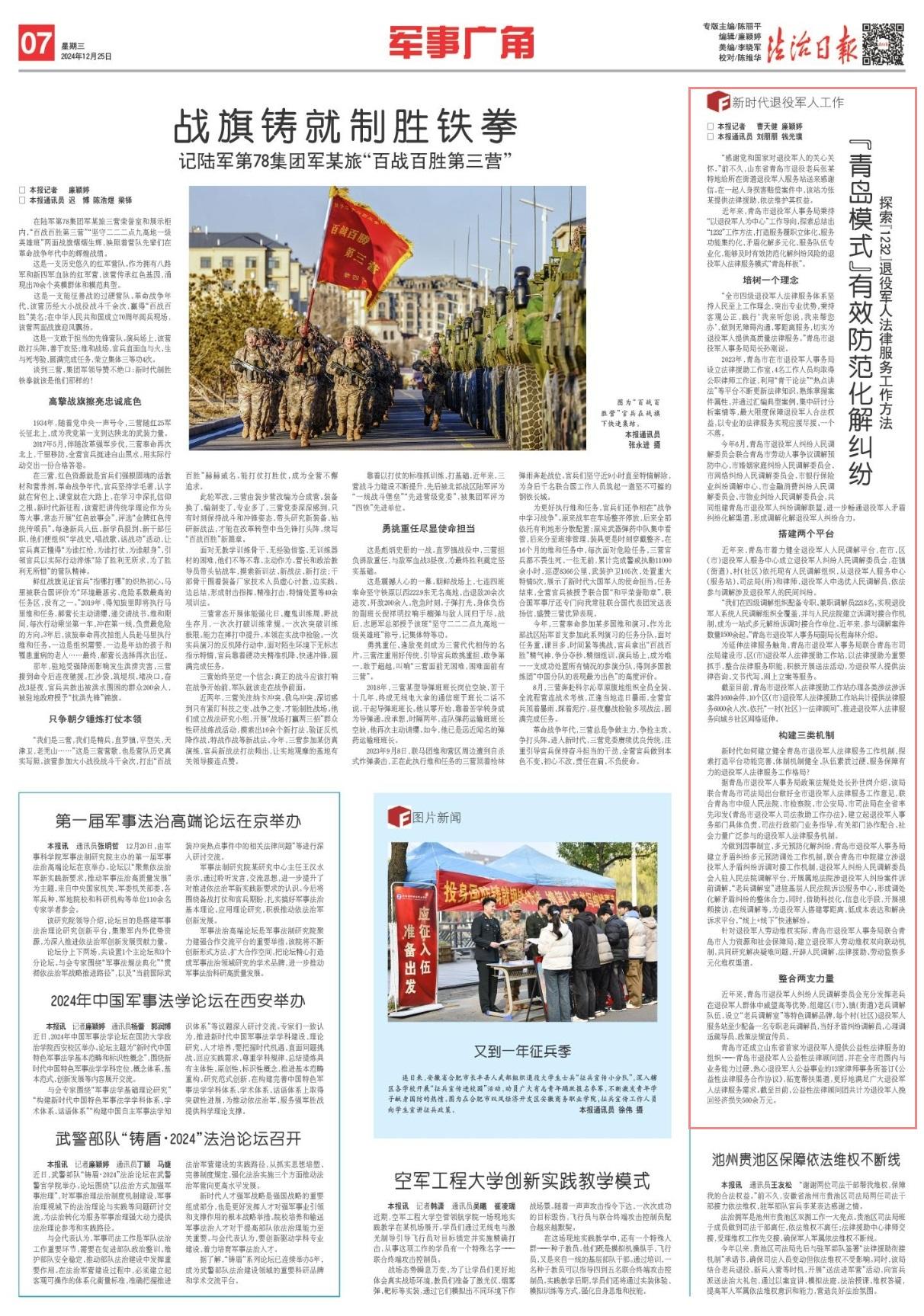 近年來(lái),青島市退役軍人事務(wù)局秉持“以退役軍人為中心”工作導(dǎo)向,探索總結(jié)出“1232”工作方法,打造服務(wù)履職立體化、服務(wù)功能集約化、矛盾化解多元化、服務(wù)隊(duì)伍專業(yè)化,能夠及時(shí)有效防范化解糾紛風(fēng)險(xiǎn)的退役軍人法律服務(wù)模式“青島樣板”。