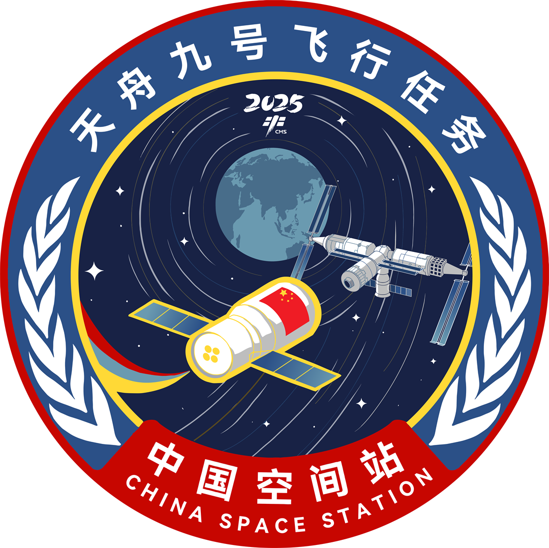 天舟九號飛行任務標識,以地球為背景,飛船與空間站交會對接為視覺中心,展現(xiàn)二者環(huán)繞飛行的壯麗姿態(tài)。飛船的動感弧線代表飛行軌跡,傳遞精準和力量的美感。星軌巧繪數(shù)字“9”,九顆星辰環(huán)繞其間,寓意天舟九號邁向未來,承載著探索太空的遠大理想與團隊協(xié)作精神。標識外圈紅色熾熱,象征國家榮譽與使命;金色點綴其間,輝映輝煌成就。內圈深藍如宇宙,廣袤無垠,襯托出白色空間站與飛船。