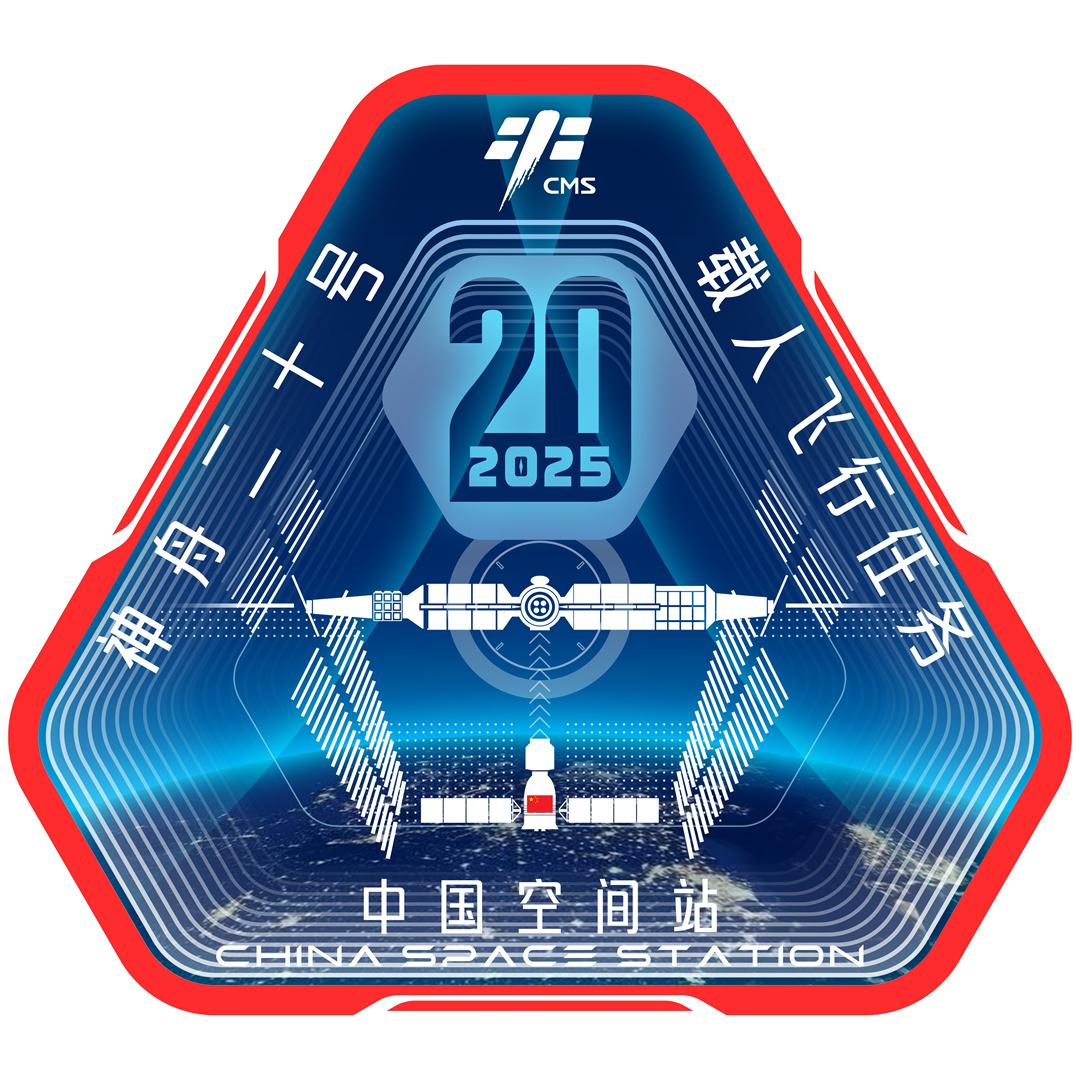 神舟二十號載人飛行任務標識,以穩(wěn)定三角形為基,象征航天人在經(jīng)驗基礎上攀登新高峰。外框紅色傳承載人飛行使命,內部深藍寓意浩瀚太空。主體神舟飛船徑向對接空間站,太陽翼巧構中文“廿”字(即“二十”)??臻g站亮光劃破天際,彰顯航天人向光前行、勇往直前的精神。