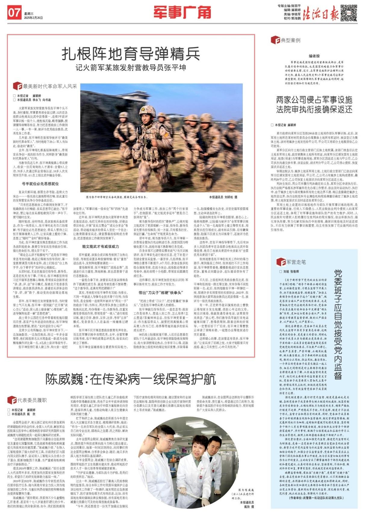 陸強(qiáng)的轉(zhuǎn)變張平坤看在眼里、喜在心上。他牽線搭橋,讓陸強(qiáng)與被評為“全軍軍事訓(xùn)練先進(jìn)個(gè)人”的一名高級軍士建立幫帶關(guān)系,用典型示范引領(lǐng)成長。前有標(biāo)兵引路,后有鞭策激勵(lì),陸強(qiáng)不僅成長為訓(xùn)練骨干,還被評為優(yōu)秀政治教員。