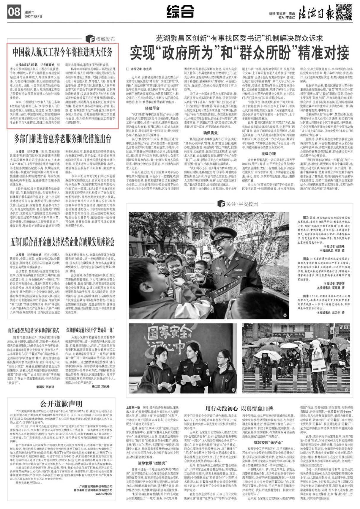 記者3月3日從中國(guó)載人航天工程辦公室獲悉,今年,中國(guó)載人航天工程將扎實(shí)推進(jìn)空間站應(yīng)用與發(fā)展和載人月球探測(cè)兩大任務(wù),為推動(dòng)科技強(qiáng)國(guó)、航天強(qiáng)國(guó)建設(shè)作出更大貢獻(xiàn)。目前,中國(guó)空間站在軌運(yùn)行穩(wěn)定、效益發(fā)揮良好,載人月球探測(cè)工程登月階段任務(wù)各項(xiàng)研制建設(shè)工作按計(jì)劃穩(wěn)步推進(jìn)。