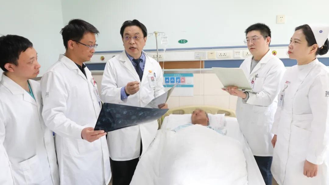 圖為姜凱主任帶領(lǐng)團隊醫(yī)務(wù)人員在查房中討論病情,并指導(dǎo)手術(shù)后的病人進行科學(xué)訓(xùn)練,加快康復(fù)進度。