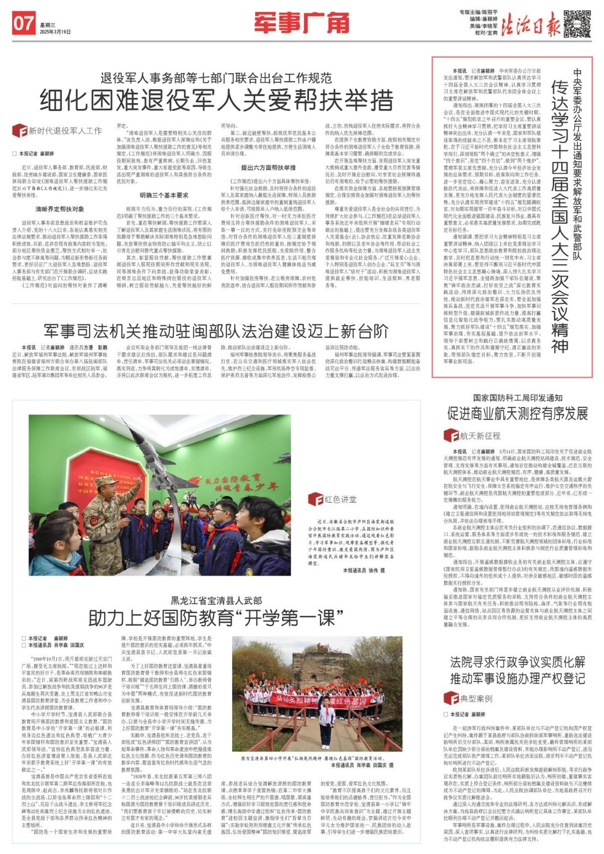 中央軍委辦公廳日前發(fā)出通知,要求解放軍和武警部隊(duì)認(rèn)真?zhèn)鬟_(dá)學(xué)習(xí)十四屆全國(guó)人大三次會(huì)議精神,認(rèn)真學(xué)習(xí)貫徹習(xí)主席在解放軍和武警部隊(duì)代表團(tuán)全體會(huì)議上的重要講話精神。
