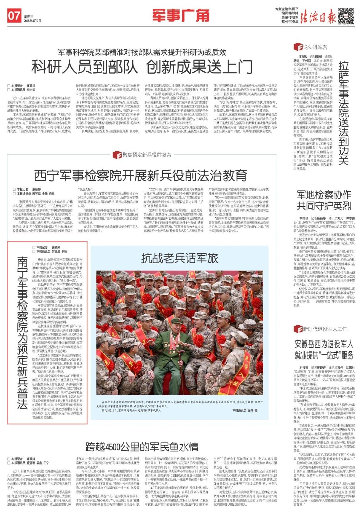 連日來,解放軍南寧軍事檢察院聯(lián)合廣西壯族自治區(qū)人民政府征兵辦公室,開展2025年度春季入伍預(yù)定新兵役前普法教育,以“需求清單+法治服務(wù)”的普法模式,通過現(xiàn)場及視頻連線方式授課65場次,為8500余名預(yù)定新兵送上“法治第一課”。