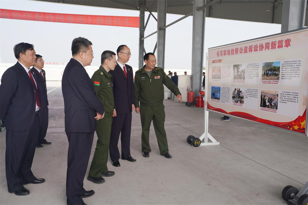 圖為與會(huì)人員參觀軍地檢察公益訴訟為保護(hù)軍事設(shè)施取得的成績(jī)。