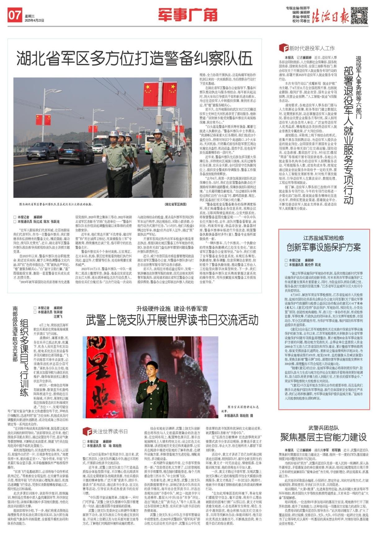 4月18日,解放軍南京軍事檢察院、江蘇省鹽城市人民檢察院、鹽城市國(guó)防動(dòng)員委員會(huì)聯(lián)合辦公室共同簽署《關(guān)于強(qiáng)化軍事設(shè)施保護(hù)行政履職與檢察公益訴訟協(xié)作配合的意見(jiàn)》(以下簡(jiǎn)稱(chēng)《意見(jiàn)》),《意見(jiàn)》堅(jiān)持“依法保護(hù)、軍地協(xié)同、預(yù)防優(yōu)先、分類(lèi)處置”原則,創(chuàng)造性地構(gòu)建檢、軍、政三位一體協(xié)作機(jī)制,形成檢察監(jiān)督、軍事統(tǒng)籌、行政執(zhí)法的閉環(huán)體系,充分發(fā)揮軍地檢察、市國(guó)動(dòng)辦、軍分區(qū)的職能作用,為保護(hù)軍事設(shè)施,維護(hù)國(guó)防和軍事利益提供有益探索。