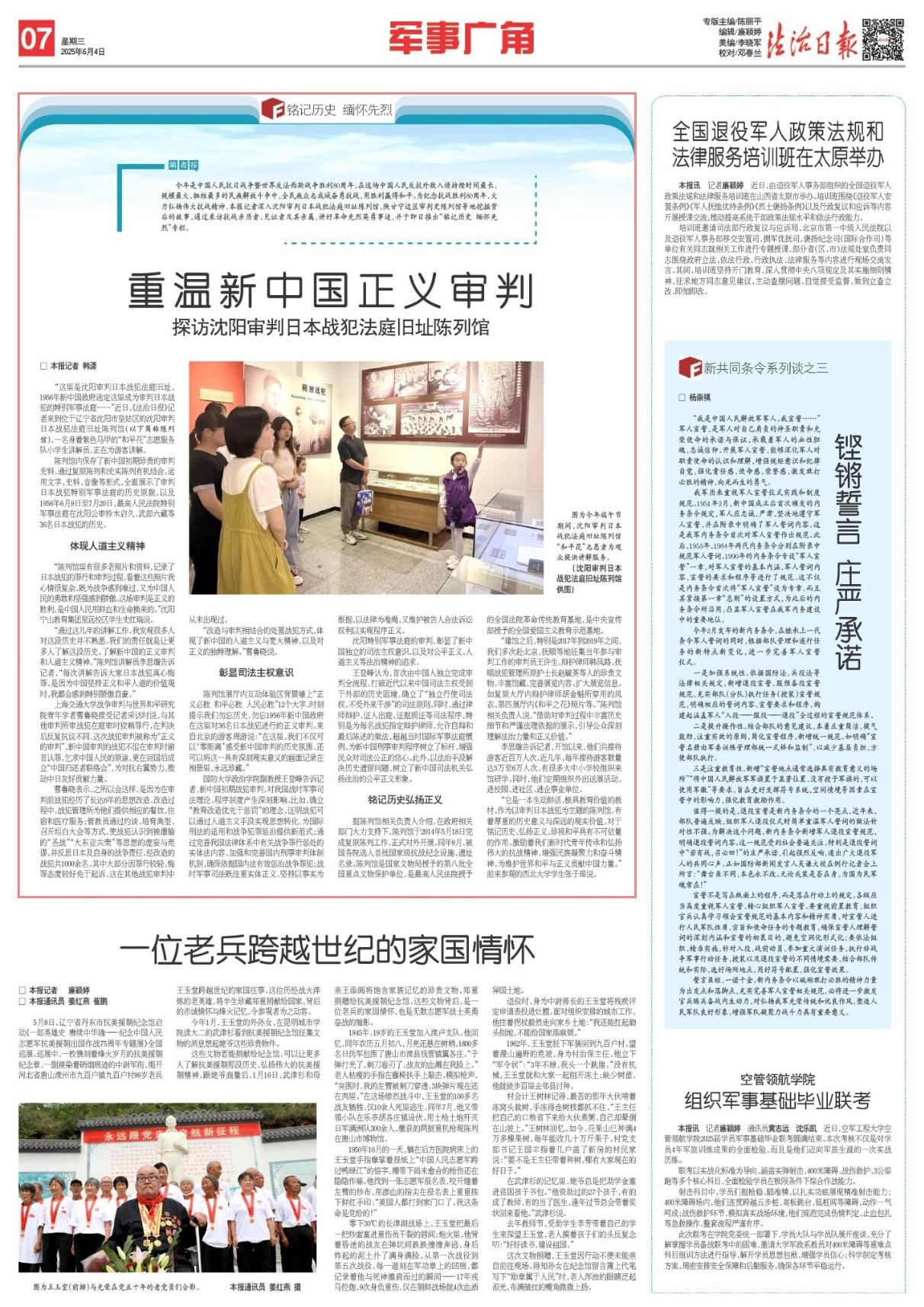 今年是中國人民抗日戰(zhàn)爭暨世界反法西斯戰(zhàn)爭勝利80周年。在這場中國人民反抗外敵入侵持續(xù)時間最長、規(guī)模最大、犧牲最多的民族解放斗爭中,全民族眾志成城奮勇抗戰(zhàn),用勝利贏得和平。為紀(jì)念抗戰(zhàn)勝利80周年,大力弘揚偉大抗戰(zhàn)精神,本報記者深入沈陽審判日本戰(zhàn)犯法庭舊址陳列館、陜甘寧邊區(qū)審判史陳列館等地挖掘背后的故事,通過采訪抗戰(zhàn)親歷者、見證者及其親屬,講好革命先烈英勇事跡,并于即日推出“銘記歷史 緬懷先烈”專欄。