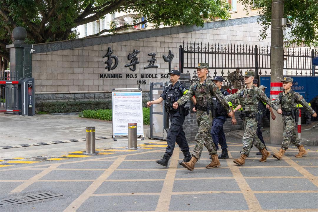 圖為武警官兵在考場入口進(jìn)行徒步巡邏。盧泳鋼 攝