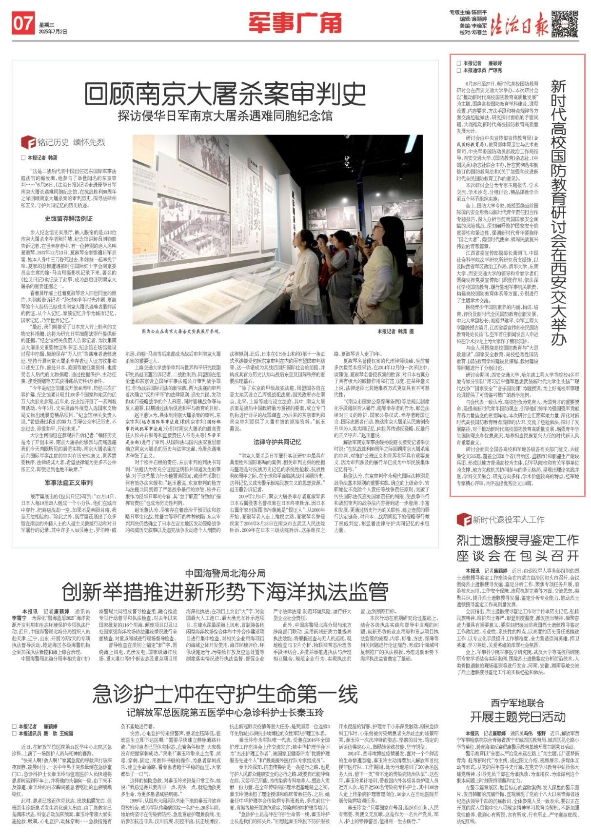 6月26日至27日,新時代高校國防教育研討會在西安交通大學舉辦。本次研討會以“推動新時代高校國防教育高質(zhì)量發(fā)展”為主題,圍繞高校國防教育學科建設、課程設置、內(nèi)容要求、方法手段和特點規(guī)律等方面交流經(jīng)驗做法、研究探討面臨的矛盾問題,共商推動新時代高校國防教育高質(zhì)量發(fā)展大計。