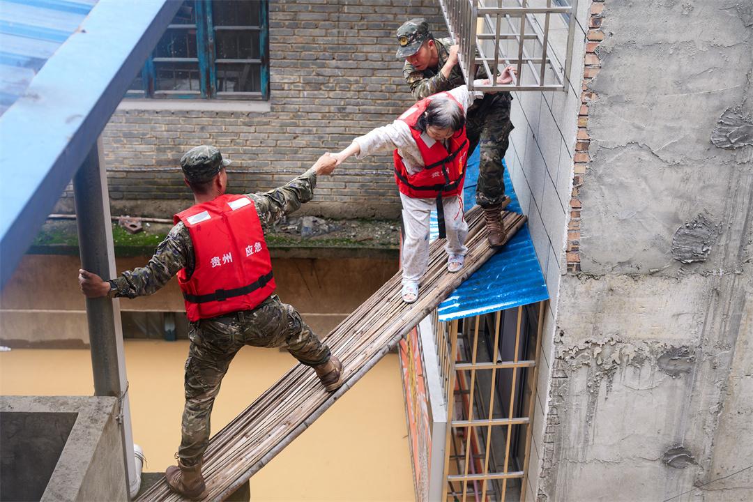 “老鄉(xiāng),我們是從凱里趕過(guò)來(lái)救災(zāi)的武警支隊(duì),這次洪峰過(guò)境風(fēng)險(xiǎn)比較高……”“政府不會(huì)不管大家的……”陳方明耐心勸說(shuō),終于打動(dòng)老人同意撤離。