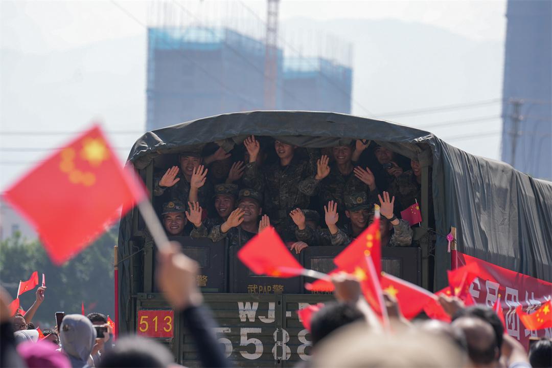 圖為完成抗洪搶險(xiǎn)任務(wù)后,武警官兵向送行人群揮手告別。趙浩翔 攝