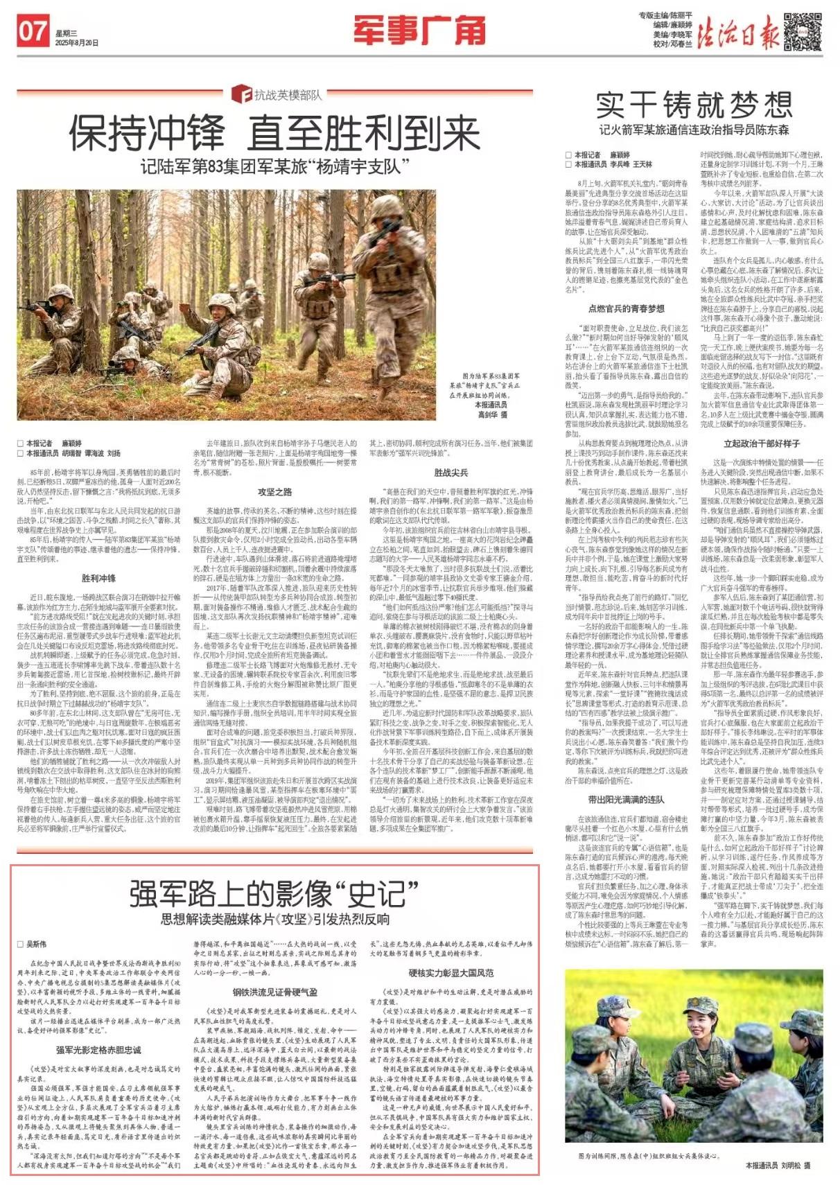 在紀(jì)念中國(guó)人民抗日戰(zhàn)爭(zhēng)暨世界反法西斯戰(zhàn)爭(zhēng)勝利80周年到來(lái)之際,近日,中央軍委政治工作部聯(lián)合中央網(wǎng)信辦、中央廣播電視總臺(tái)攝制的5集思想解讀類(lèi)融媒體片《攻堅(jiān)》,以豐富新穎的視聽(tīng)手段、多維立體的一線資料,細(xì)膩描繪新時(shí)代人民軍隊(duì)全力以赴打好實(shí)現(xiàn)建軍一百年奮斗目標(biāo)攻堅(jiān)戰(zhàn)的火熱實(shí)景。