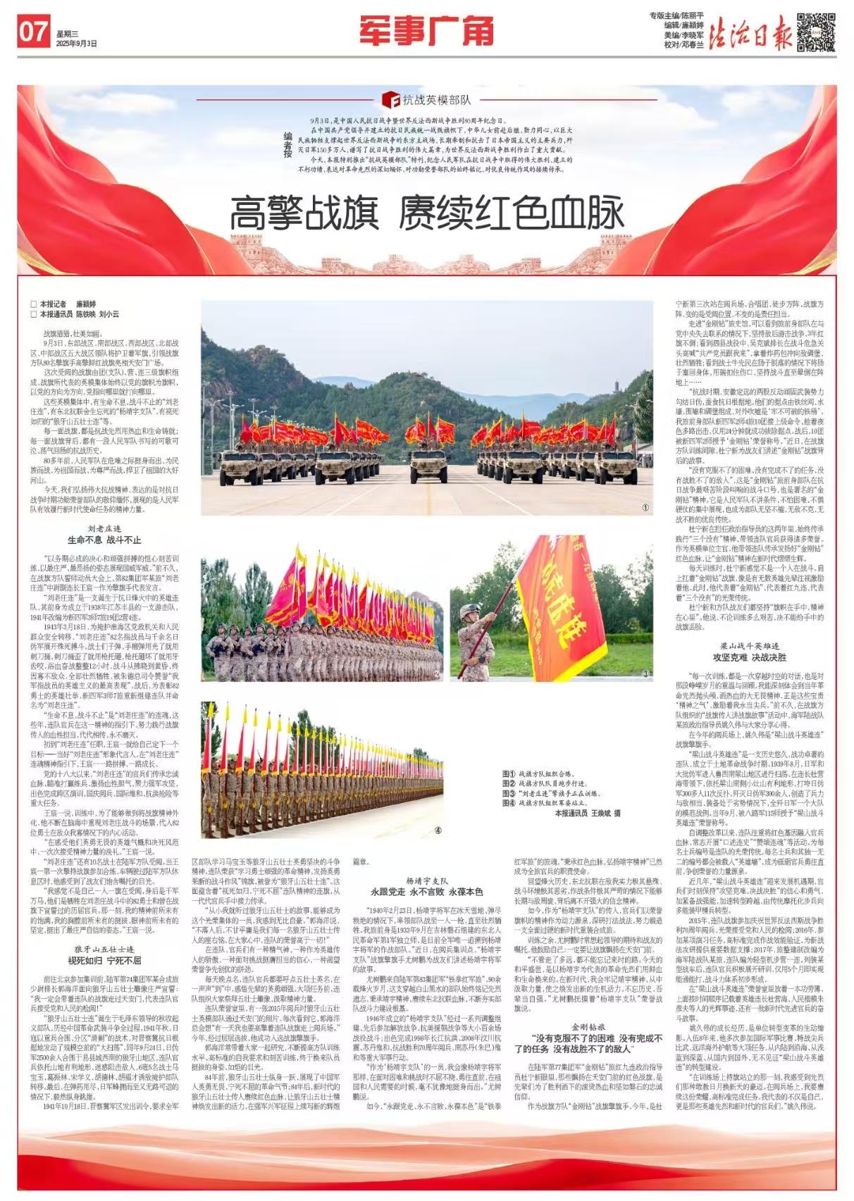 今天,本報特別推出“抗戰(zhàn)英模部隊”特刊,紀念人民軍隊在抗日戰(zhàn)爭中取得的偉大勝利、建立的不朽功績,表達對革命先烈的深切緬懷、對功勛榮譽部隊的始終銘記、對優(yōu)良傳統(tǒng)作風的接續(xù)傳承。