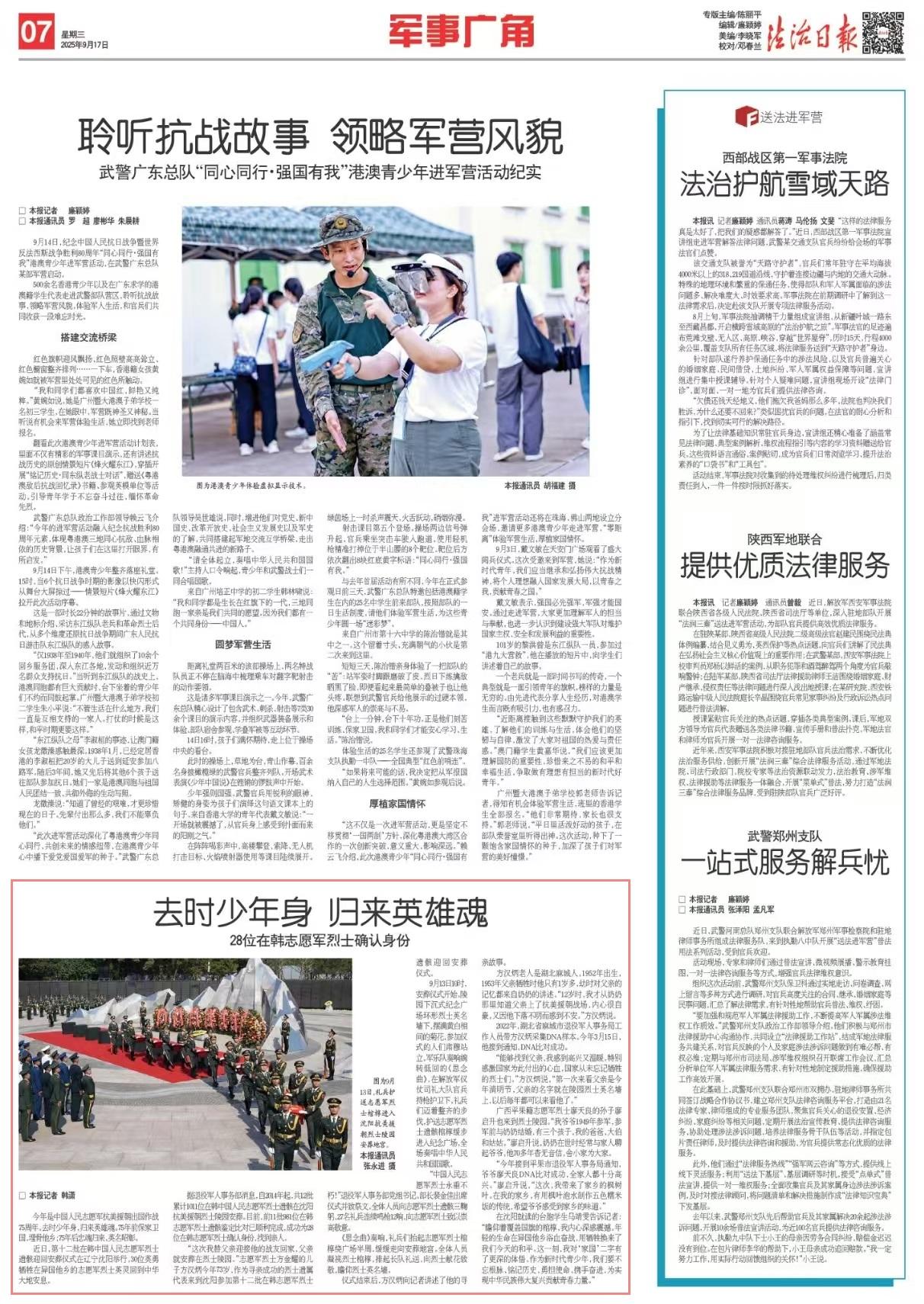 在沈陽就讀的臺胞學(xué)生馬靖雯告訴記者:“瞻仰著覆蓋國旗的棺槨,我內(nèi)心深感震撼。年輕的生命在異國他鄉(xiāng)浴血奮戰(zhàn),用犧牲換來了我們今天的和平。這一刻,我對‘家國’二字有了更深的體悟。作為新時代青少年,我們要不忘根脈、銘記歷史,勇?lián)姑?、攜手奮進,為實現(xiàn)中華民族偉大復(fù)興貢獻青春力量。”