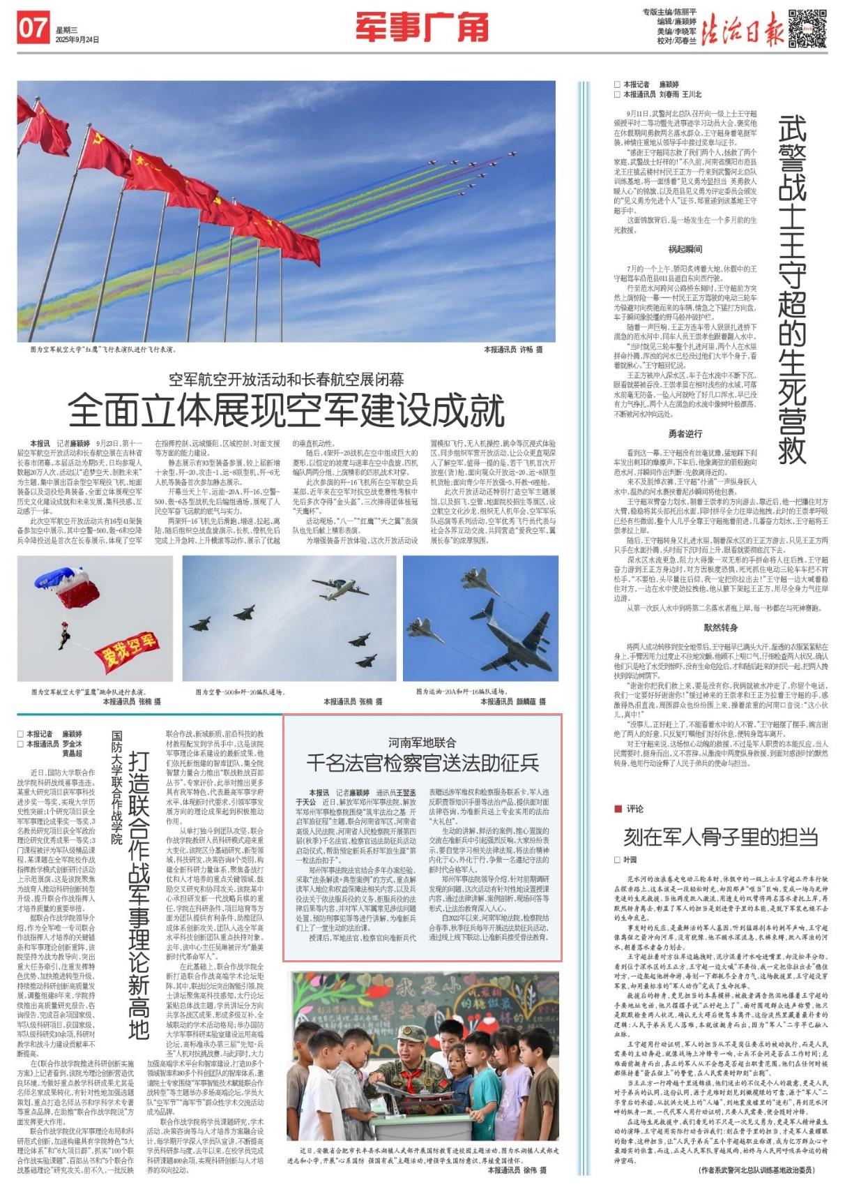 近日,解放軍鄭州軍事法院、解放軍鄭州軍事檢察院圍繞“筑牢法治之基 開啟軍旅征程”主題,聯(lián)合河南省軍區(qū)、河南省高級(jí)人民法院、河南省人民檢察院開展第四屆(秋季)千名法官、檢察官送法助征兵活動(dòng)啟動(dòng)儀式,幫助預(yù)定新兵系好軍旅生涯“第一粒法治扣子”。