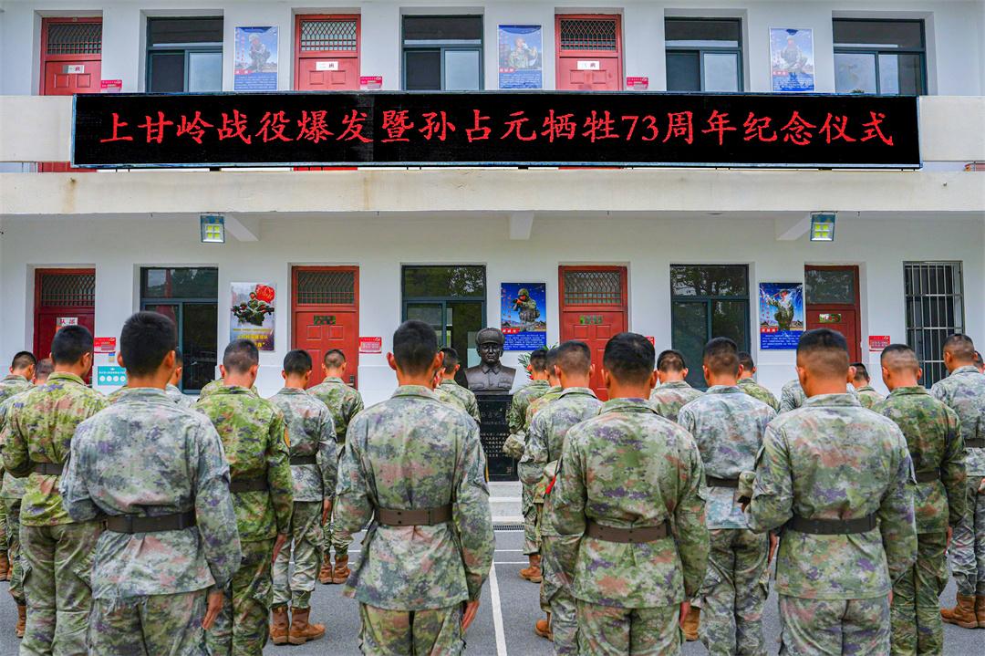 紀(jì)念儀式開始,連隊(duì)官兵仔細(xì)整理花籃綢帶,并脫帽默哀,深切緬懷孫占元老排長?;ɑ@上“紀(jì)念上甘嶺戰(zhàn)役爆發(fā)73周年”“紀(jì)念一級(jí)英雄孫占元犧牲73周年”的綢帶隨風(fēng)飄揚(yáng)。