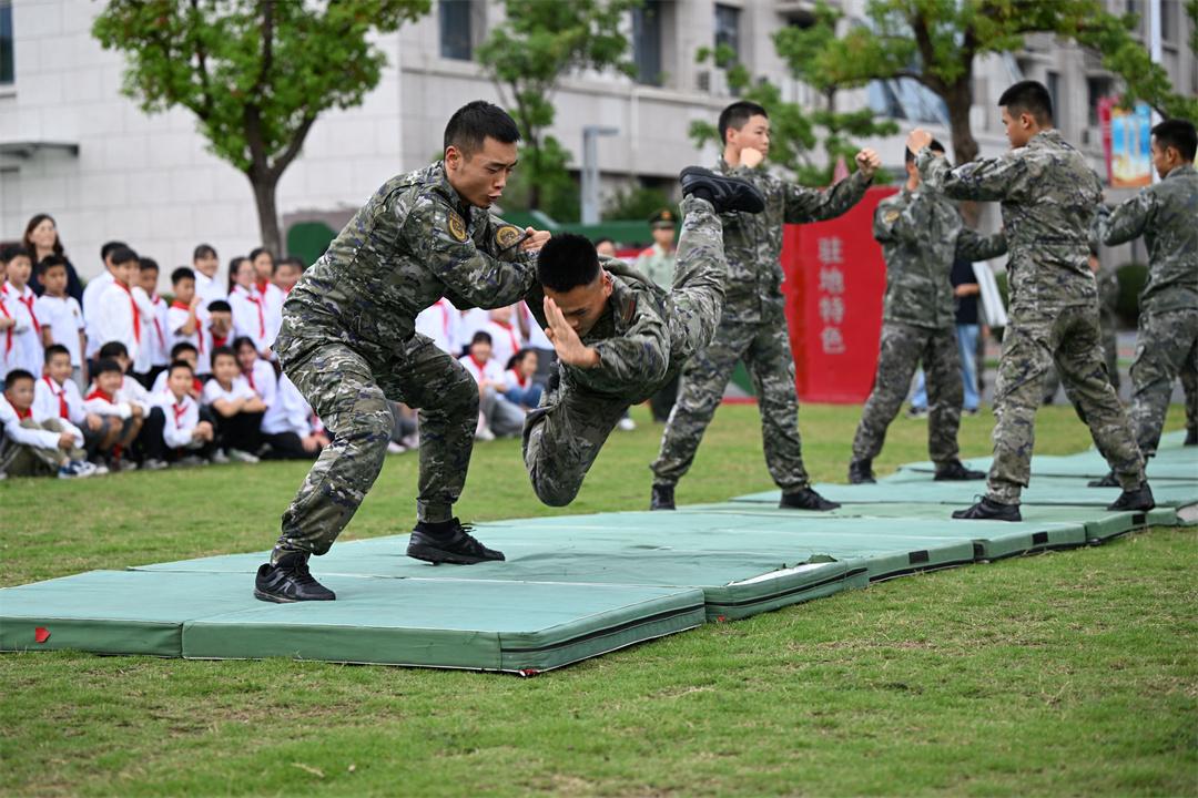 圖為武警戰(zhàn)士向小學(xué)生演示摔擒動(dòng)作。