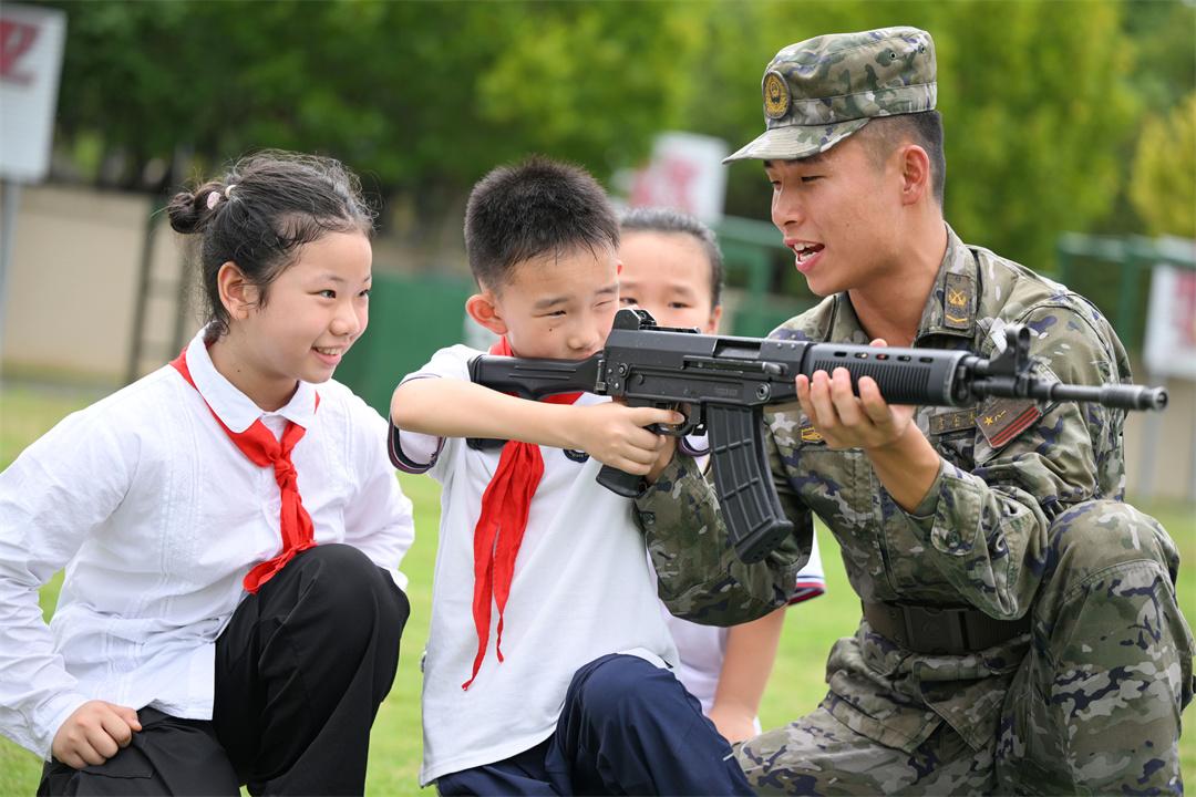 圖為小學(xué)生在武警戰(zhàn)士指導(dǎo)下體驗(yàn)裝備。