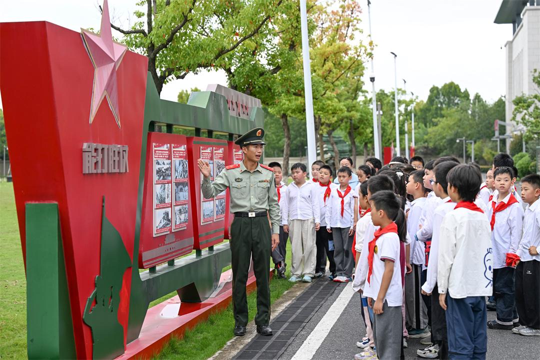 圖為武警戰(zhàn)士向小學(xué)生講述戰(zhàn)斗故事。