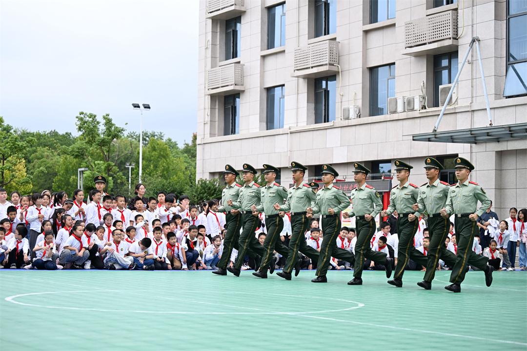 圖為武警戰(zhàn)士向小學(xué)生演示隊(duì)列動(dòng)作。