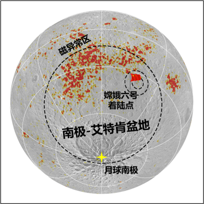 圖為嫦娥六號(hào)任務(wù)著陸點(diǎn)位于月球南極-艾特肯(South Pole-Aitken,SPA)盆地東北方向的阿波羅盆地中,與SPA盆地西北部的磁異常區(qū)相鄰。本研究基于嫦娥六號(hào)樣品中鐵氧化物的發(fā)現(xiàn)提出了一種新的月球磁異常的撞擊成因假說(shuō)。