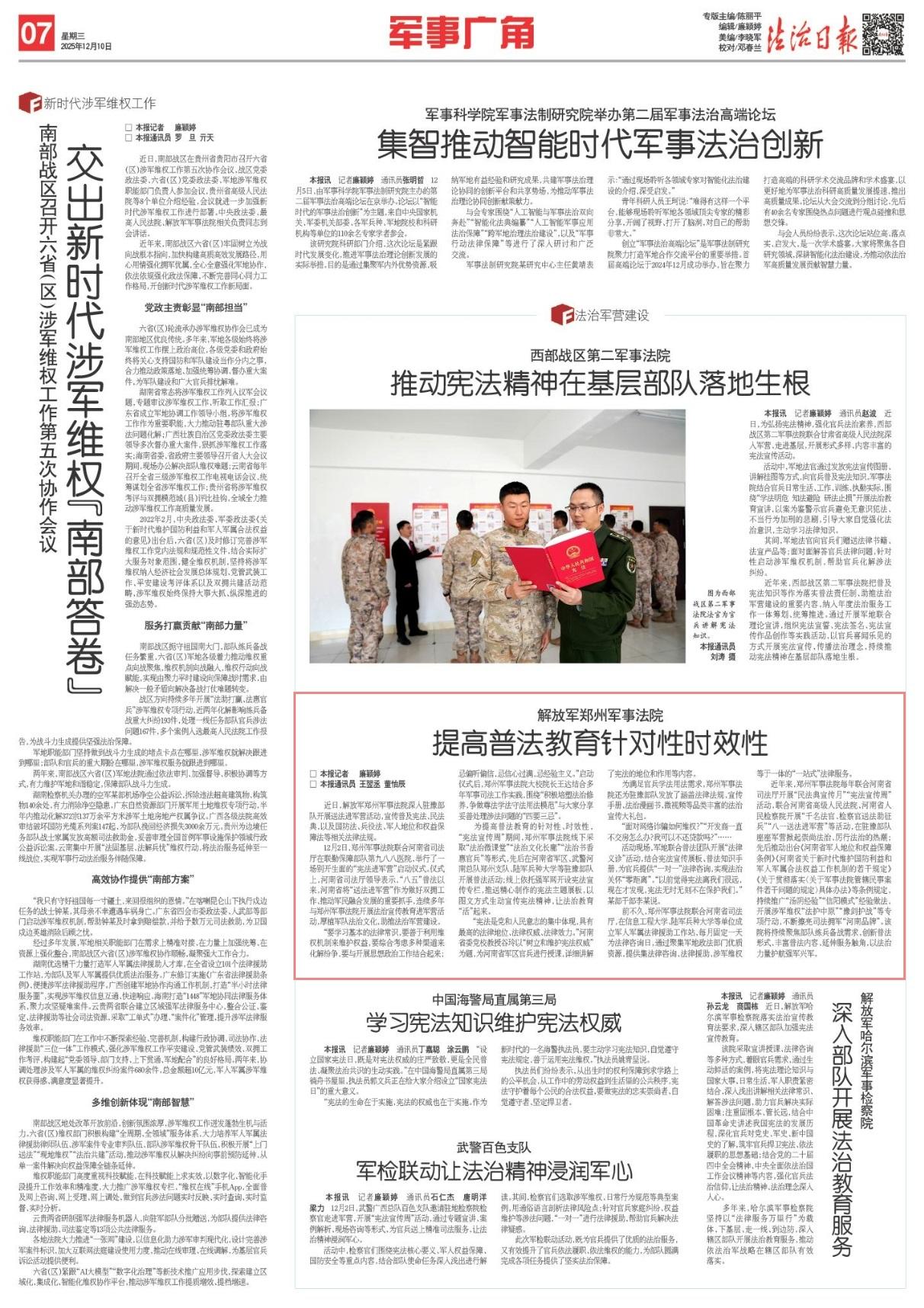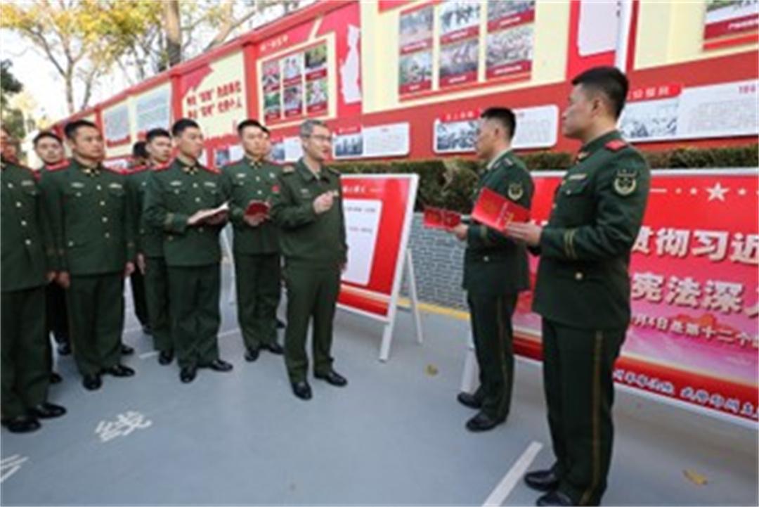 為提高普法教育的針對性、時效性,“憲法宣傳周”期間,鄭州軍事法院線下采取“法治微課堂”“法治文化長廊”“法治書香惠官兵”等形式,先后在河南省軍區(qū)、武警河南總隊鄭州支隊、陸軍兵種大學等駐豫部隊開展普法活動;線上依托強軍網(wǎng)開設憲法宣傳專欄,推送精心制作的憲法主題展板,以圖文方式生動宣傳憲法精神,讓法治教育“活”起來。