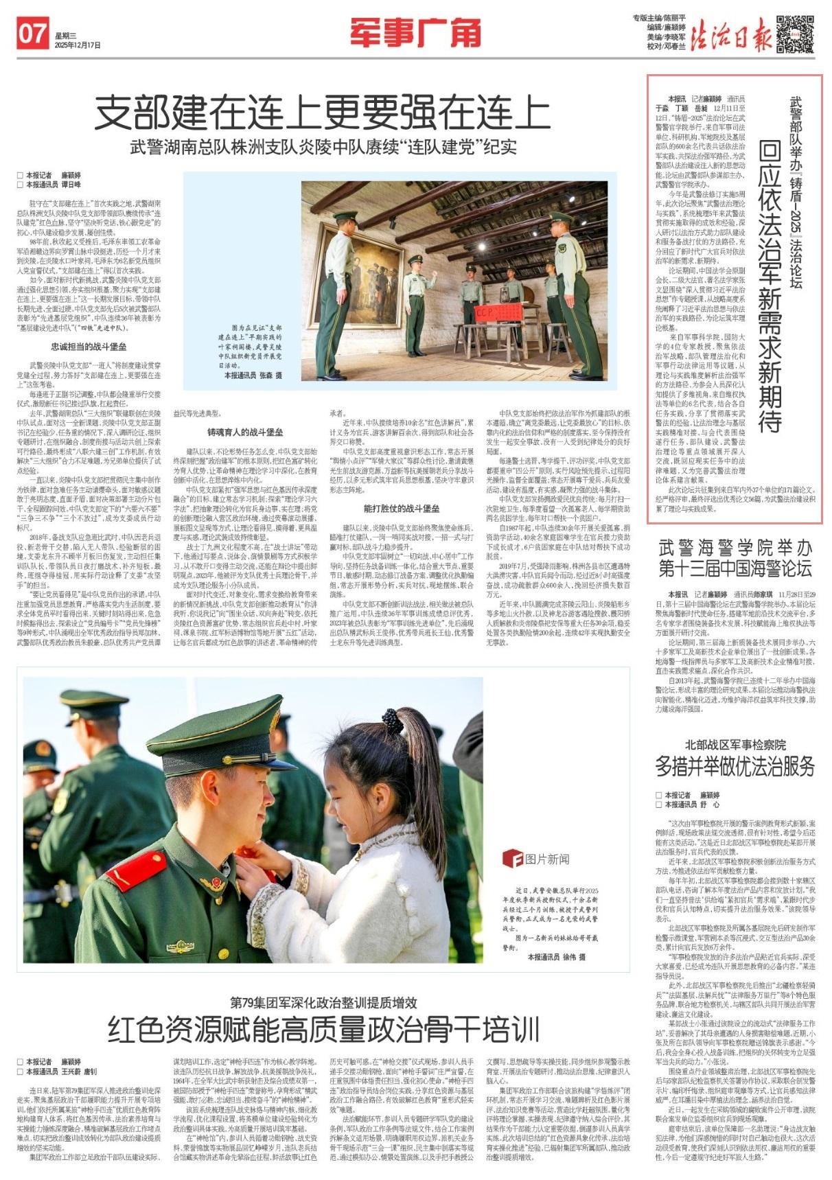 12月11日至12日,“鑄盾-2025”法治論壇在武警警官學(xué)院舉行。來自軍事司法單位、科研機構(gòu)、軍地院校及基層部隊的600余名代表共話依法治軍實踐、共探法治強軍路徑,為武警部隊法治建設(shè)注入新的思想動能。論壇由武警部隊參謀部主辦、武警警官學(xué)院承辦。
