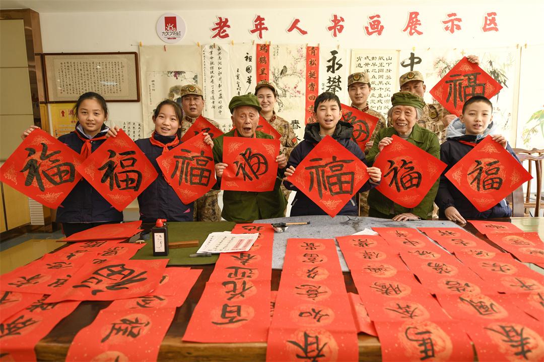 圖為小學(xué)生和抗美援朝老兵一起寫對聯(lián)。