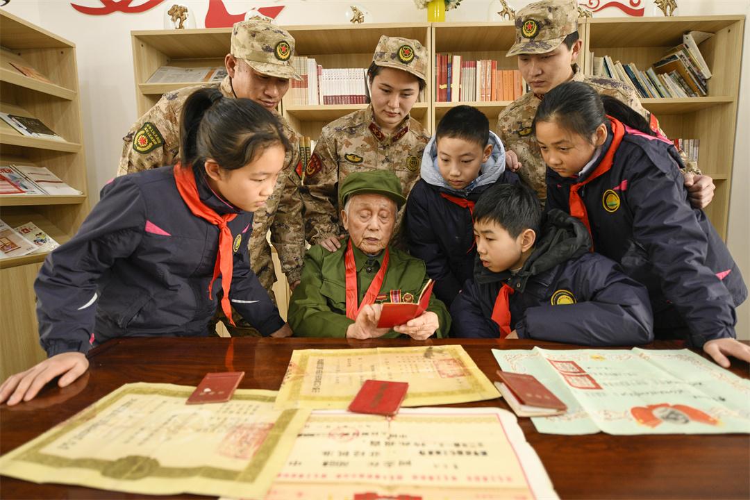 圖為12月26日,93歲抗美援朝老兵曹寶濟(jì)向小學(xué)生講述紅色故事。
