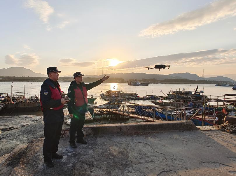 圖為海警執(zhí)法員利用無人機(jī)對轄區(qū)漁港岙口進(jìn)行巡查。袁冠卿 攝