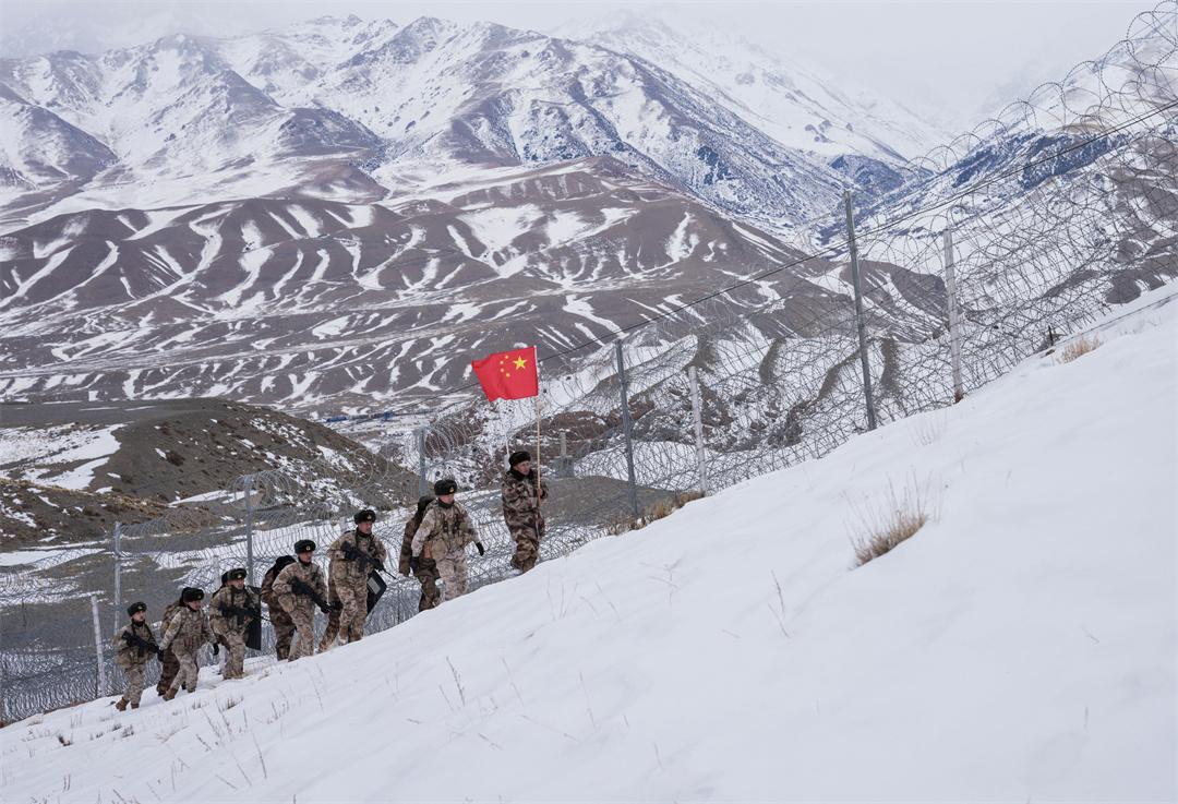 圖為斯姆哈納邊防連官兵與吉根鄉(xiāng)護(hù)邊員在邊防線上一起執(zhí)行巡邏任務(wù)。
