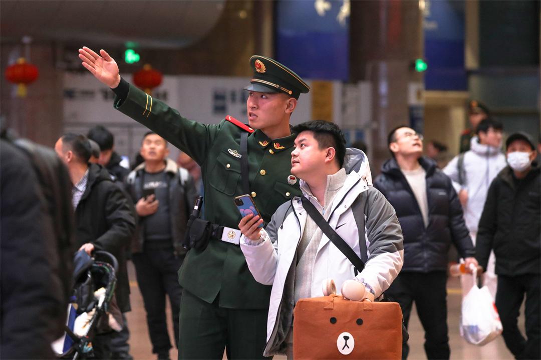 在人員密集的車站進站口、安檢區(qū)、候車大廳、檢票口等關(guān)鍵點位,官兵們始終保持高度警惕,緊盯旅客動態(tài),細致排查各類安全隱患。遇有攜帶大件行李的旅客、行動不便的老人或身有殘疾的特殊旅客,官兵們第一時間主動上前,接過沉重的行囊,耐心引導(dǎo)至候車專區(qū)、綠色通道,協(xié)調(diào)車站工作人員開通“返鄉(xiāng)優(yōu)先通道”,全程幫扶特殊旅客進站乘車。