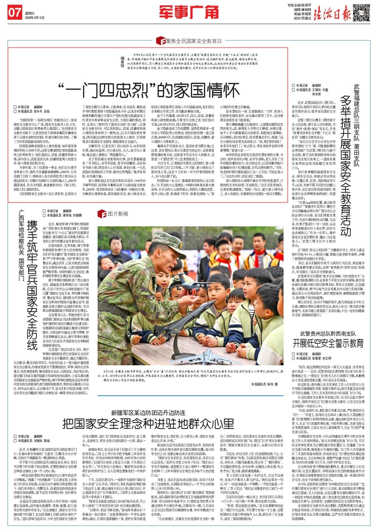 今年4月15日是第十一個(gè)全民國(guó)家安全教育日,主題為“統(tǒng)籌發(fā)展和安全 護(hù)航‘十五五’新征程”。連日來(lái),軍地?cái)y手組織開展各具特色的國(guó)家安全教育主題宣傳活動(dòng),通過緬懷英烈、普法授課、現(xiàn)場(chǎng)法律咨詢、知識(shí)競(jìng)賽等形式,深入解讀總體國(guó)家安全觀和國(guó)家安全相關(guān)法律法規(guī)。這些生動(dòng)的普法宣傳活動(dòng)緊緊圍繞國(guó)家安全領(lǐng)域重點(diǎn)內(nèi)容,深入部隊(duì)、走進(jìn)校園和轄區(qū),筑牢官兵和人民群眾國(guó)家安全防線。