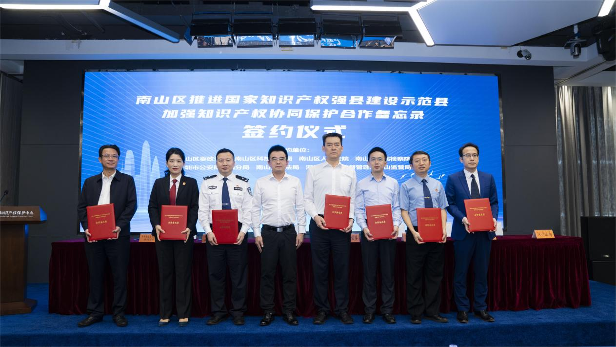 簽約儀式上,南山區(qū)委政法委、南山區(qū)科技創(chuàng)新局、南山區(qū)人民法院、南山區(qū)人民檢察院、南山區(qū)公安分局、南山區(qū)司法局、深圳市市場監(jiān)督管理局南山監(jiān)管局等7家單位共同簽約了《推進(jìn)國家知識產(chǎn)權(quán)強(qiáng)縣建設(shè)示范縣 加強(qiáng)知識產(chǎn)權(quán)協(xié)同保護(hù)合作備忘錄》(以下簡稱《合作備忘錄》)。