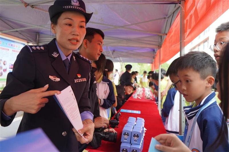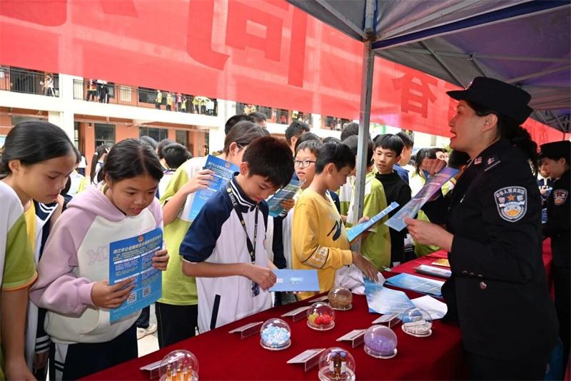 課室外,多部門聯(lián)合打造的“法治移動課堂”同步鋪開,形成全方位普法矩陣。在仿真毒品展示區(qū),禁毒民警結合新型毒品模型,揭露“跳跳糖”“奶茶粉”等偽裝手段,深刻警示學生警惕“第一口”誘惑;交警部門將流動宣傳車開進操場,循環(huán)播放本地交通事故警示片,血淋淋的案例讓圍觀學生直呼“安全帶就是生命帶”。