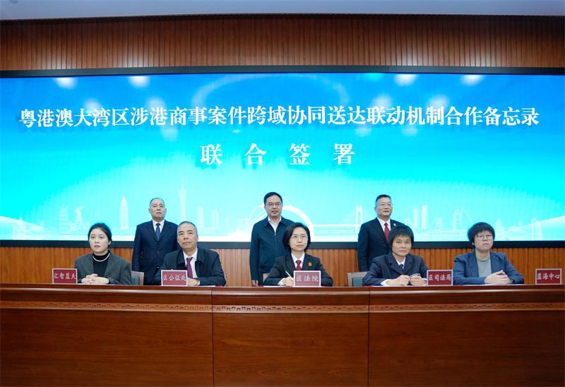 潮涌珠江,灣區(qū)同心。12月17日上午,廣東省廣州市南沙區(qū)人民法院(廣東自由貿(mào)易區(qū)南沙片區(qū)人民法院)攜手廣州市南沙區(qū)司法局、廣州市南沙公證處、深圳市藍海法律查明和商事調(diào)解中心、廣州市匯智藍天國際法律與商事服務中心暨“一帶一路”域外法查明(廣州)中心,共同簽署《關(guān)于構(gòu)建粵港澳大灣區(qū)涉港商事案件跨域協(xié)同送達聯(lián)動機制合作備忘錄》(以下簡稱《備忘錄》)。