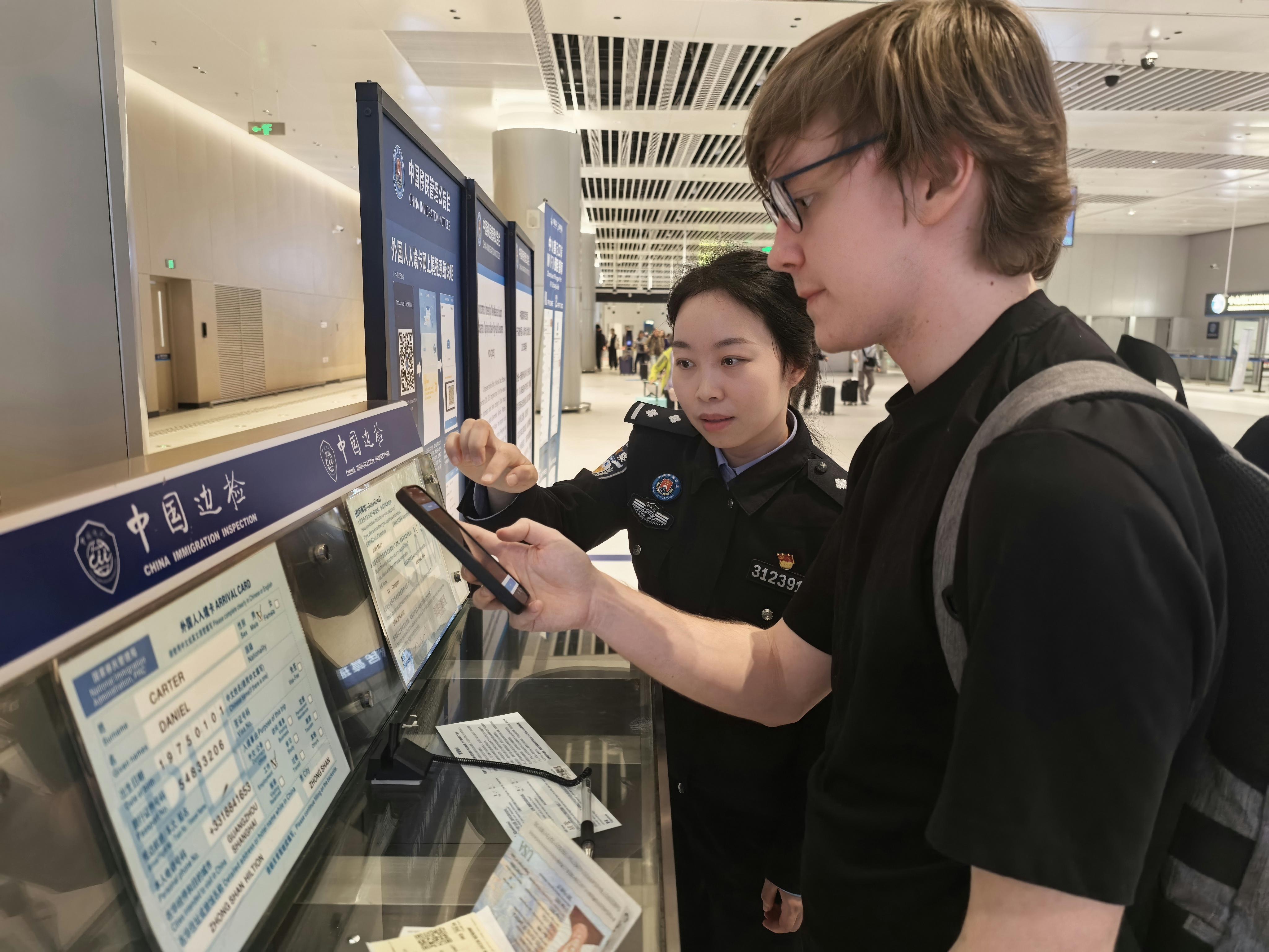 圖為中山邊檢站民警指引外籍旅客網(wǎng)上填報入境卡