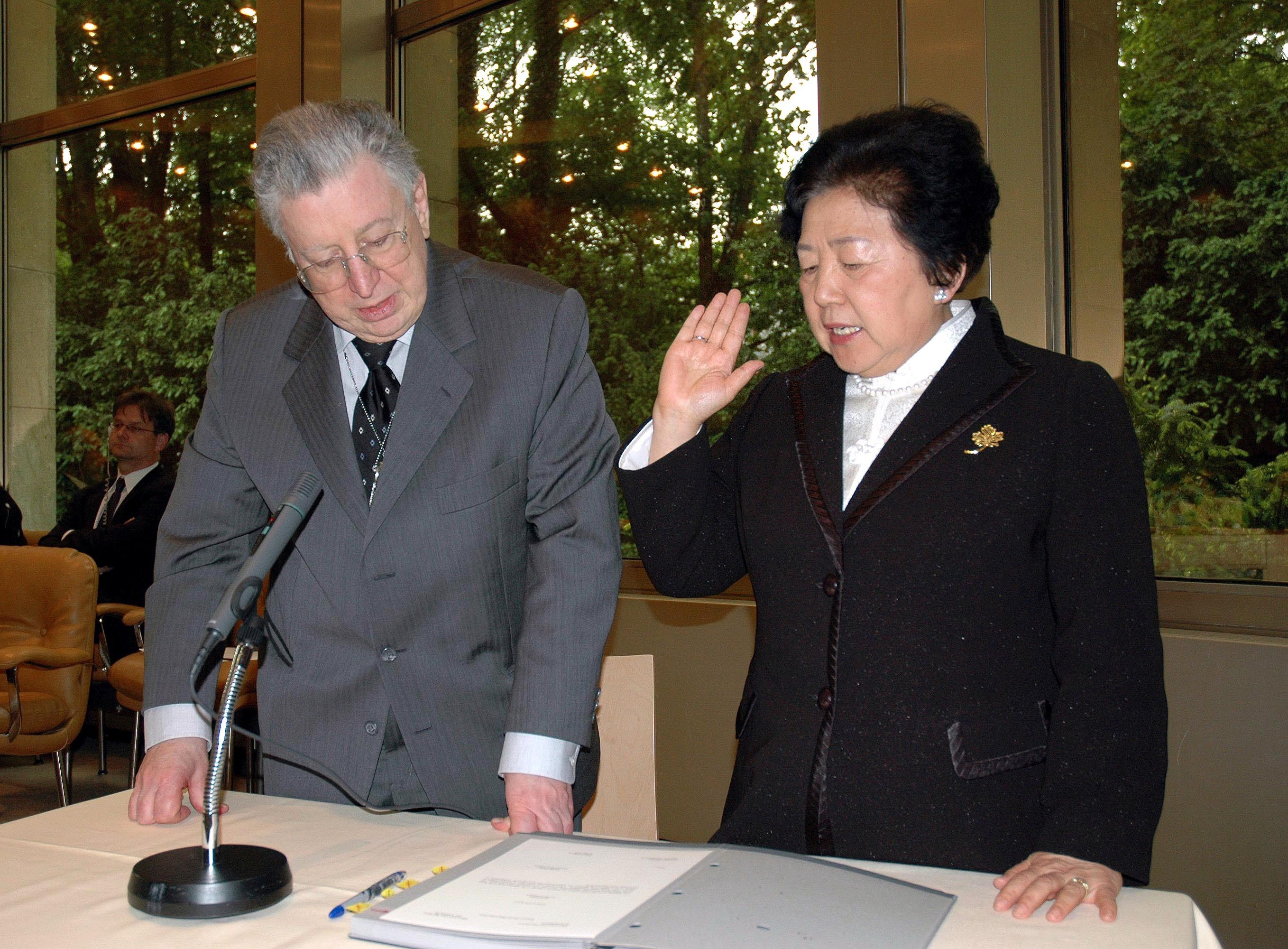 張?jiān)骆ㄓ遥┰谌諆?nèi)瓦世界貿(mào)易組織總部宣誓,正式就任世貿(mào)組織上訴機(jī)構(gòu)法官(2008年5月21日攝)。