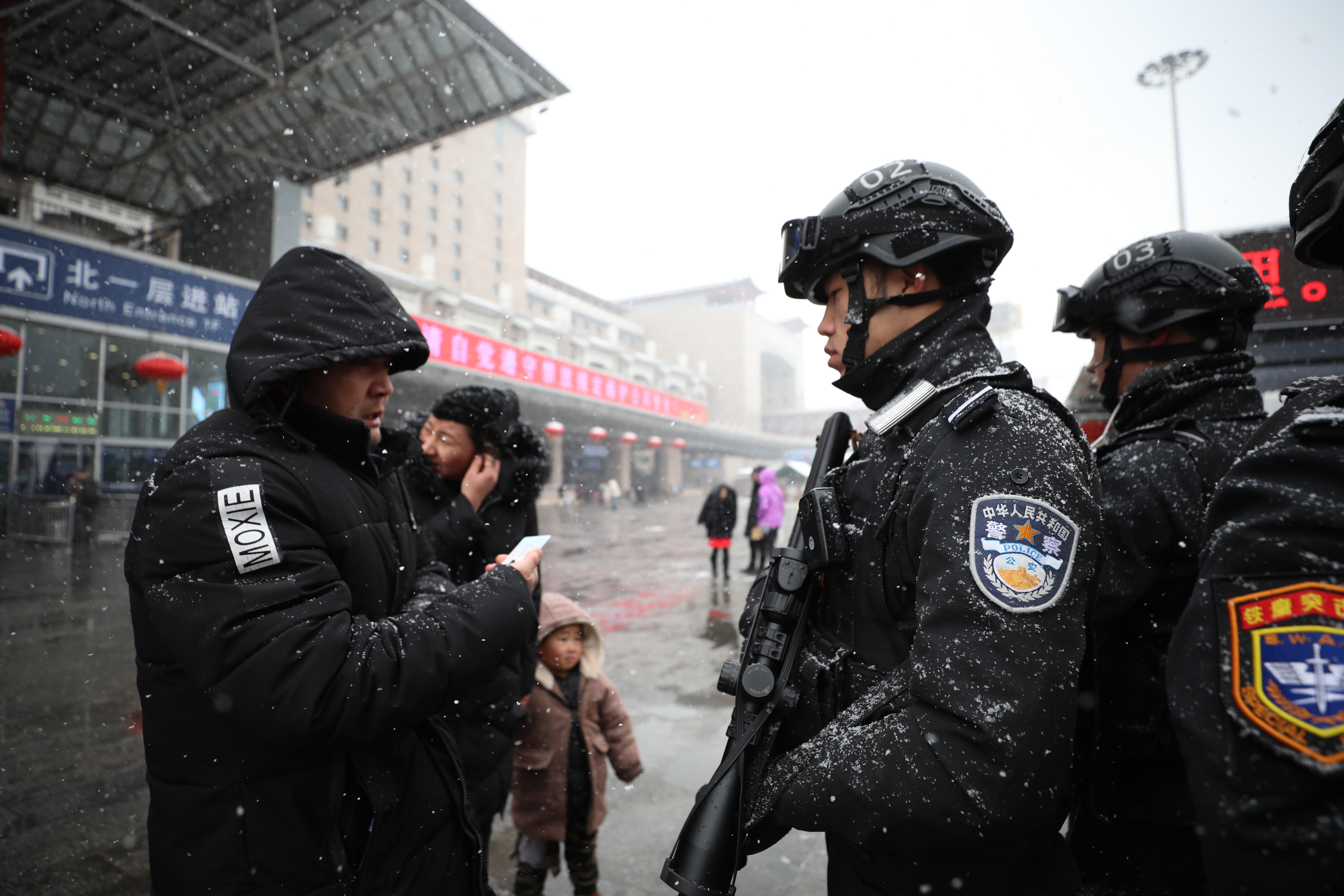 春運以來,北京鐵路公安處安排特警駐守北京站、北京西站、北京南站,加強對3大火車站的巡邏巡視、武裝震懾和盤查工作,全力確保車站治安秩序穩(wěn)定。圖為2月12日,北京大雪,參加安保任務(wù)的特警隊員們在北京各大火車站值守。