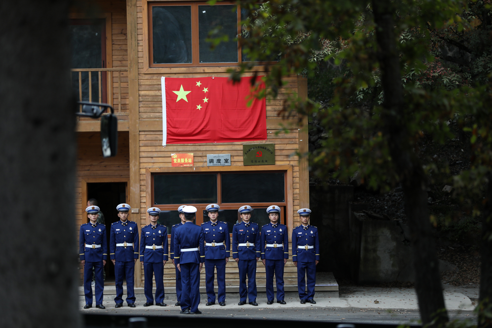 隊(duì)員們在景區(qū)調(diào)度室門前集合出發(fā)。