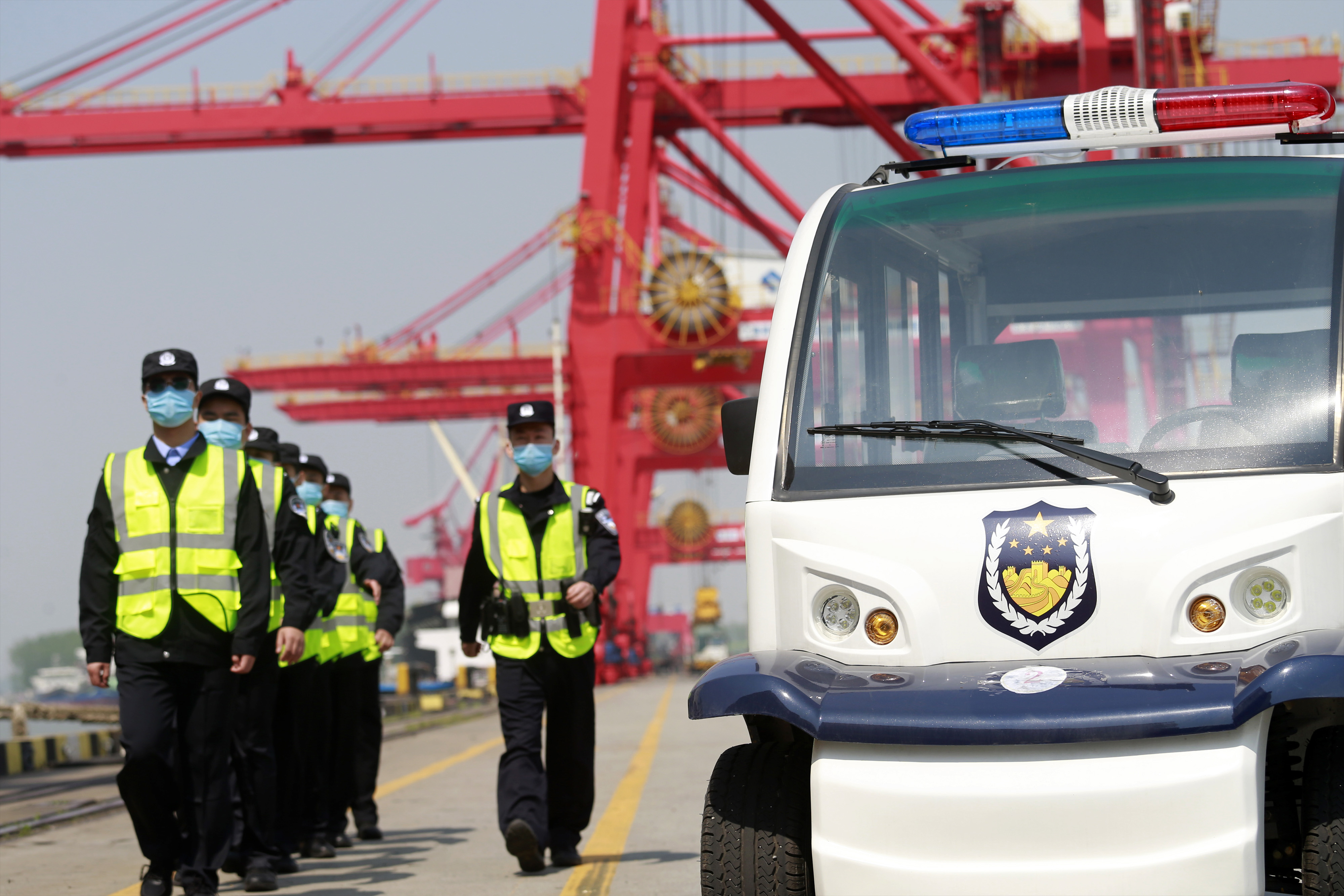 4月27日,在南京港出入境邊檢站民警的帶領下,廣西籍輔警參與碼頭巡邏。