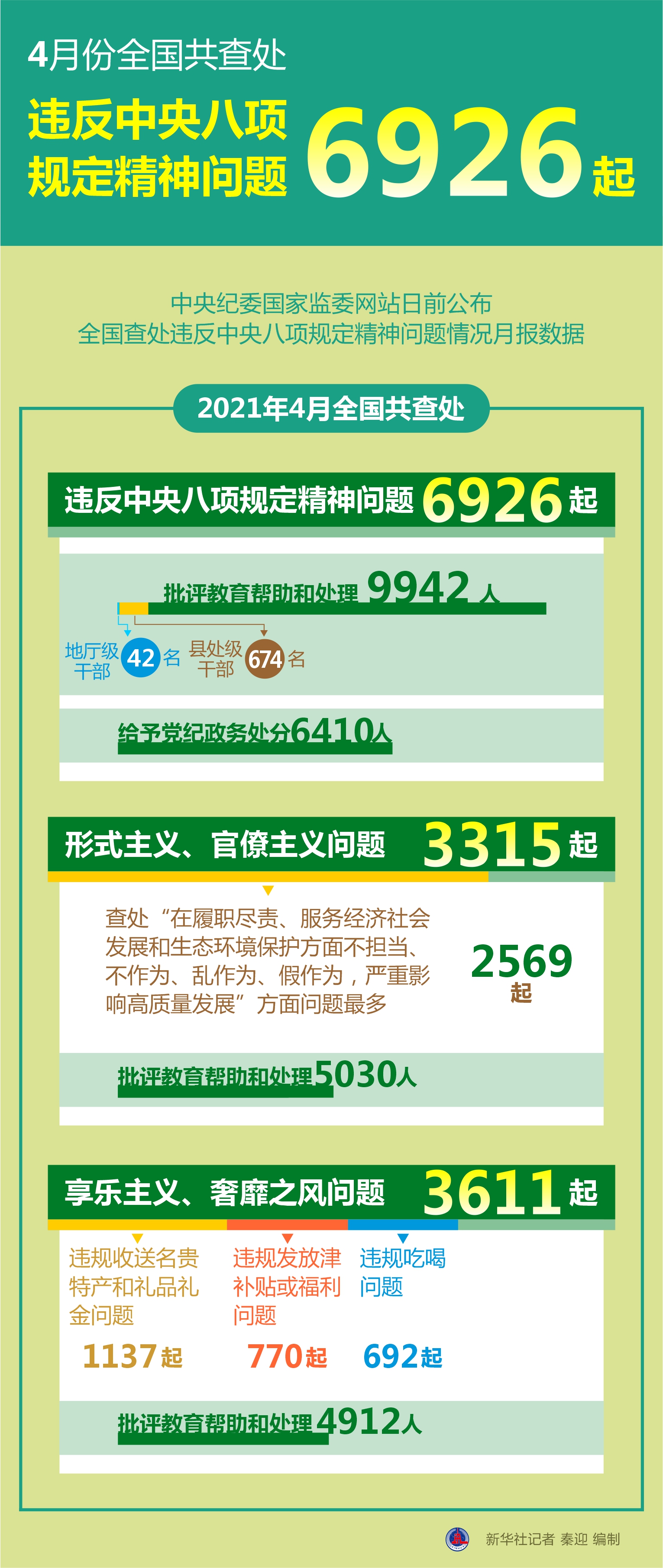 圖表:4月份全國(guó)共查處違反中央八項(xiàng)規(guī)定精神問題6926起