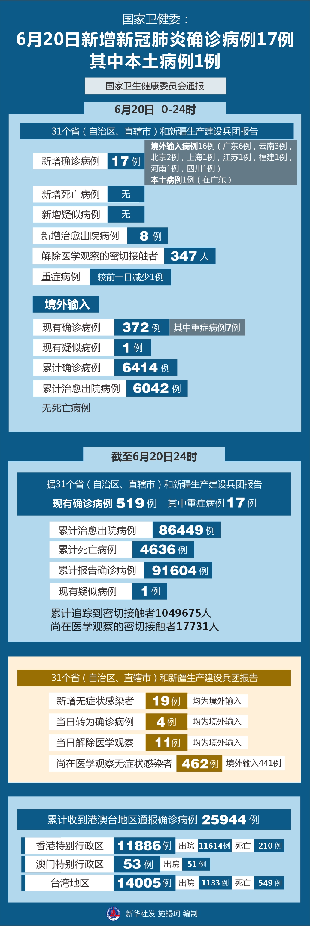 圖表:國(guó)家衛(wèi)健委:6月20日新增新冠肺炎確診病例17例 其中本土病例1例