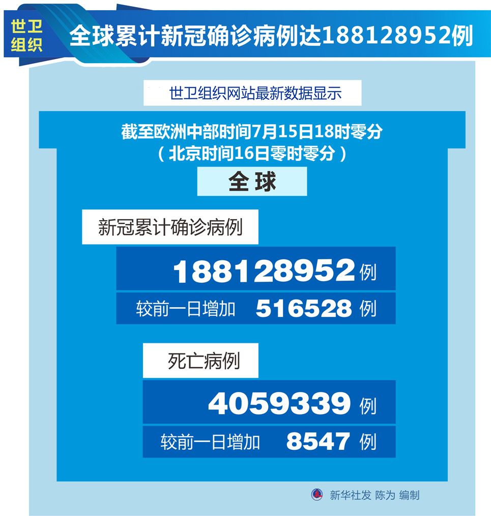 圖表:世衛(wèi)組織:全球累計新冠確診病例達188128952例